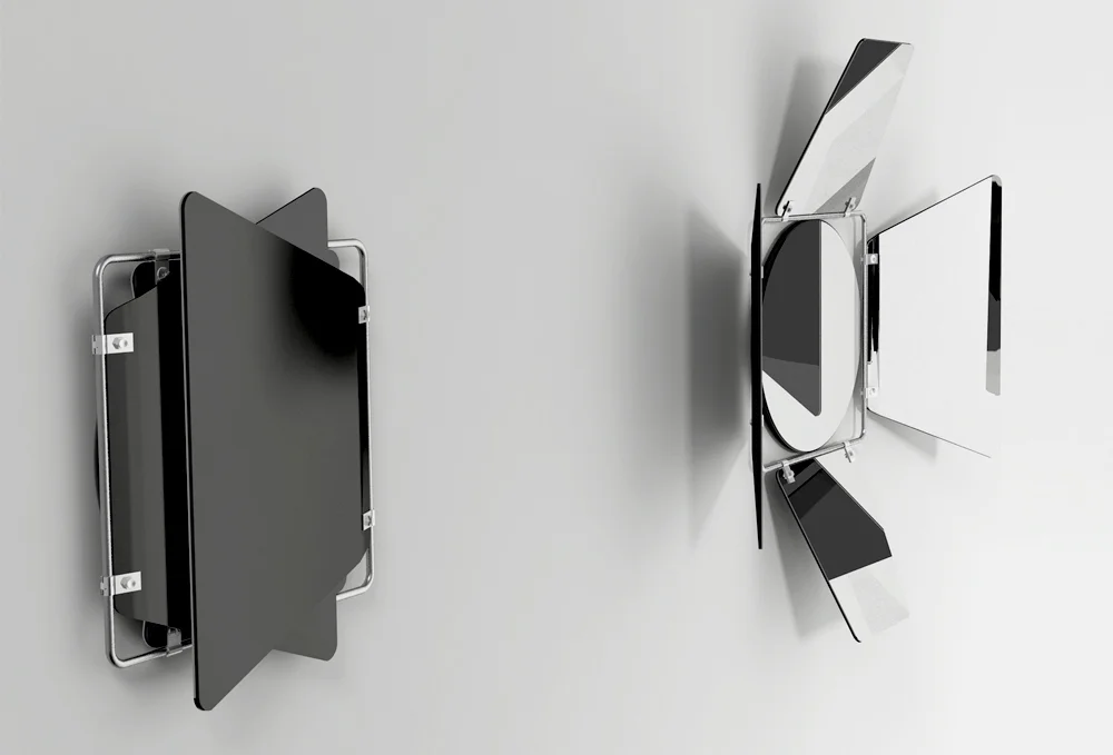 Steerable mirror inspired by a device traditionally used for lighting in theater and cinema.